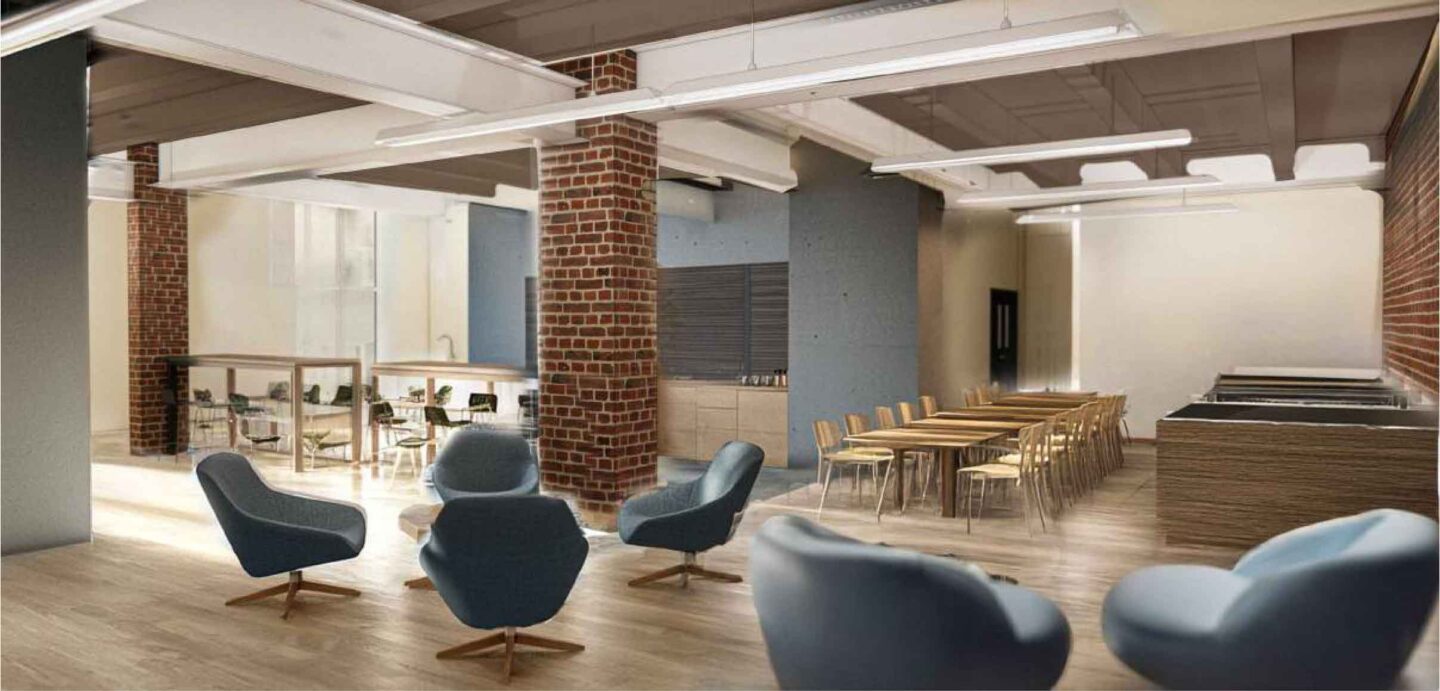 The communal café space bustles as employees grab lunches provided by urban farms/gardens and local partnerships. While enjoying fresh salads and locally made pastries, they share lively discussions with members of other nonprofits that foster collaboration and innovative thinking. In the lounge seats, students fit in a quick study session over a midday cup of coffee.